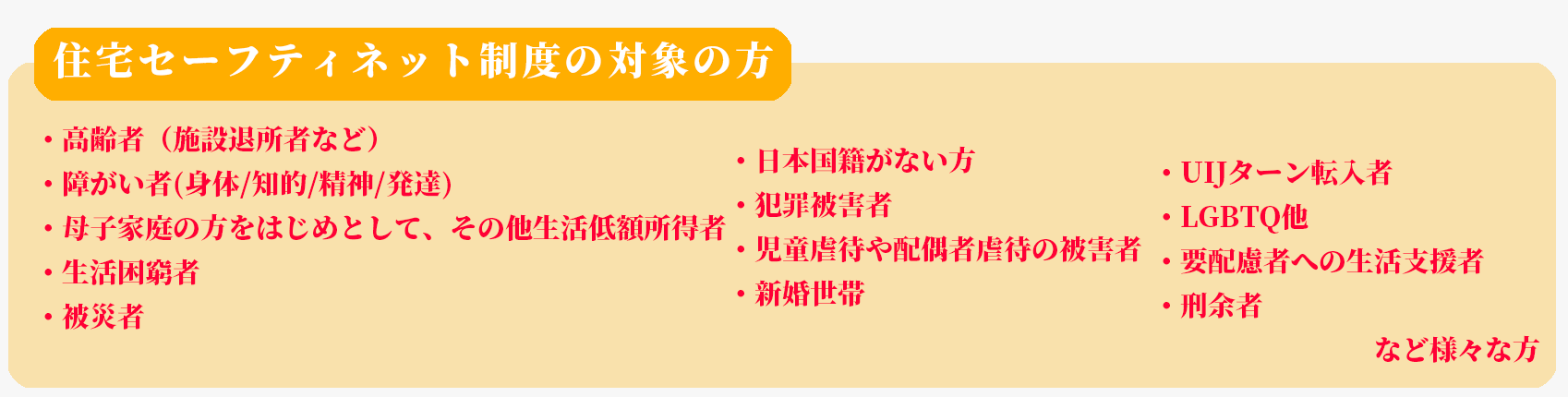 高齢者(施設退所者など)、障がい者(身体/知的/精神/発達)、母子家庭の方をはじめとして、その他生活低額所得者、生活困窮者、被災者、日本国籍がない方、犯罪被害者、児童虐待や配偶者虐待の被害者、新婚世帯、UIJターン転入者、LGBTQ他、要配慮者への生活支援者、刑余者など様々な方が利用できます。